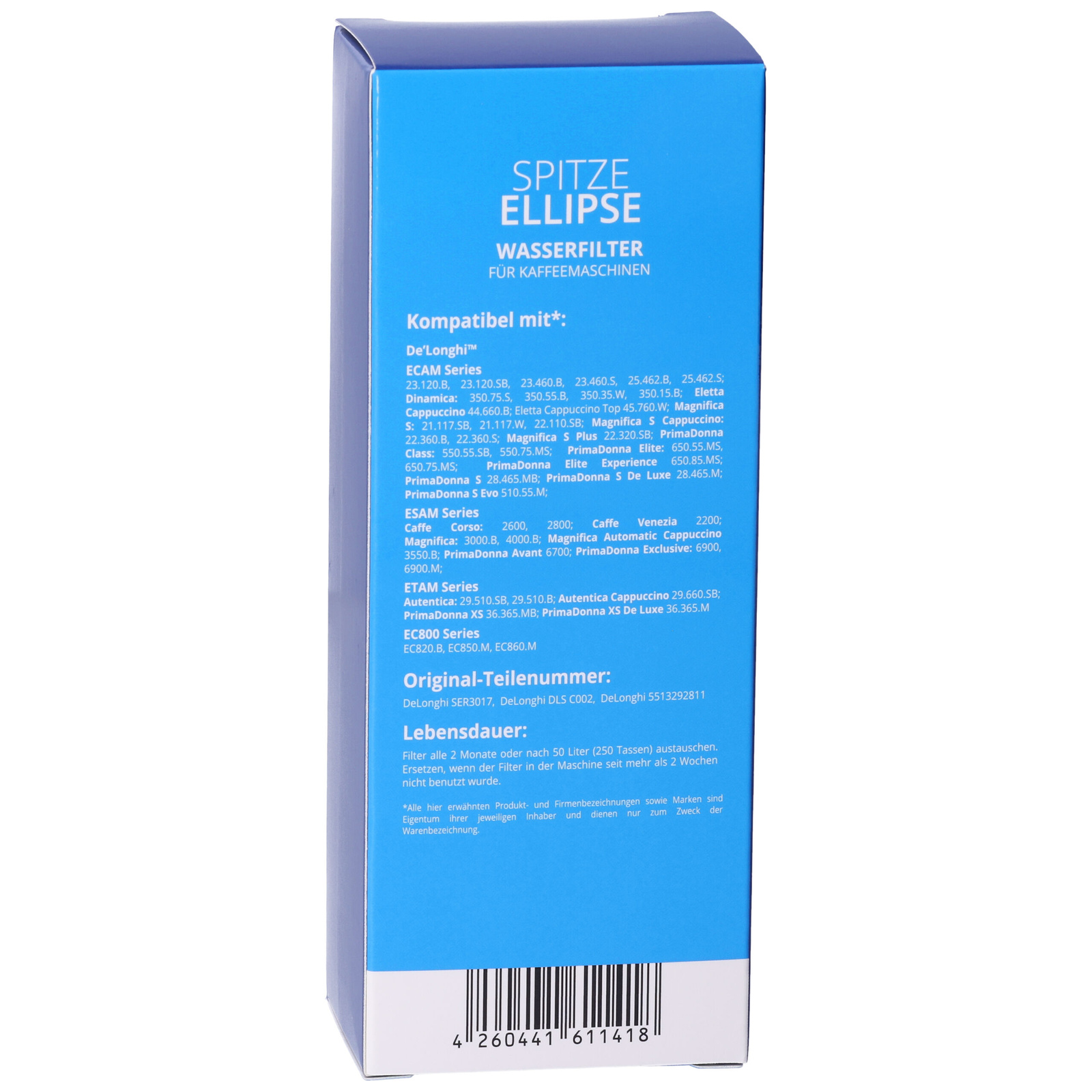 Mit dem Spitze Ellipse Wasserfilter für DeLonghi Kaffeemaschinen profitieren Sie garantiert von dem besten Angebot auf dem Markt. Die deutsche Verarbeitungsqualität in Kombination mit den hochwertigen Komponenten im Filtrationsprozess machen Ihren täglichen Kaffee zu einem genussvollen Ritual.