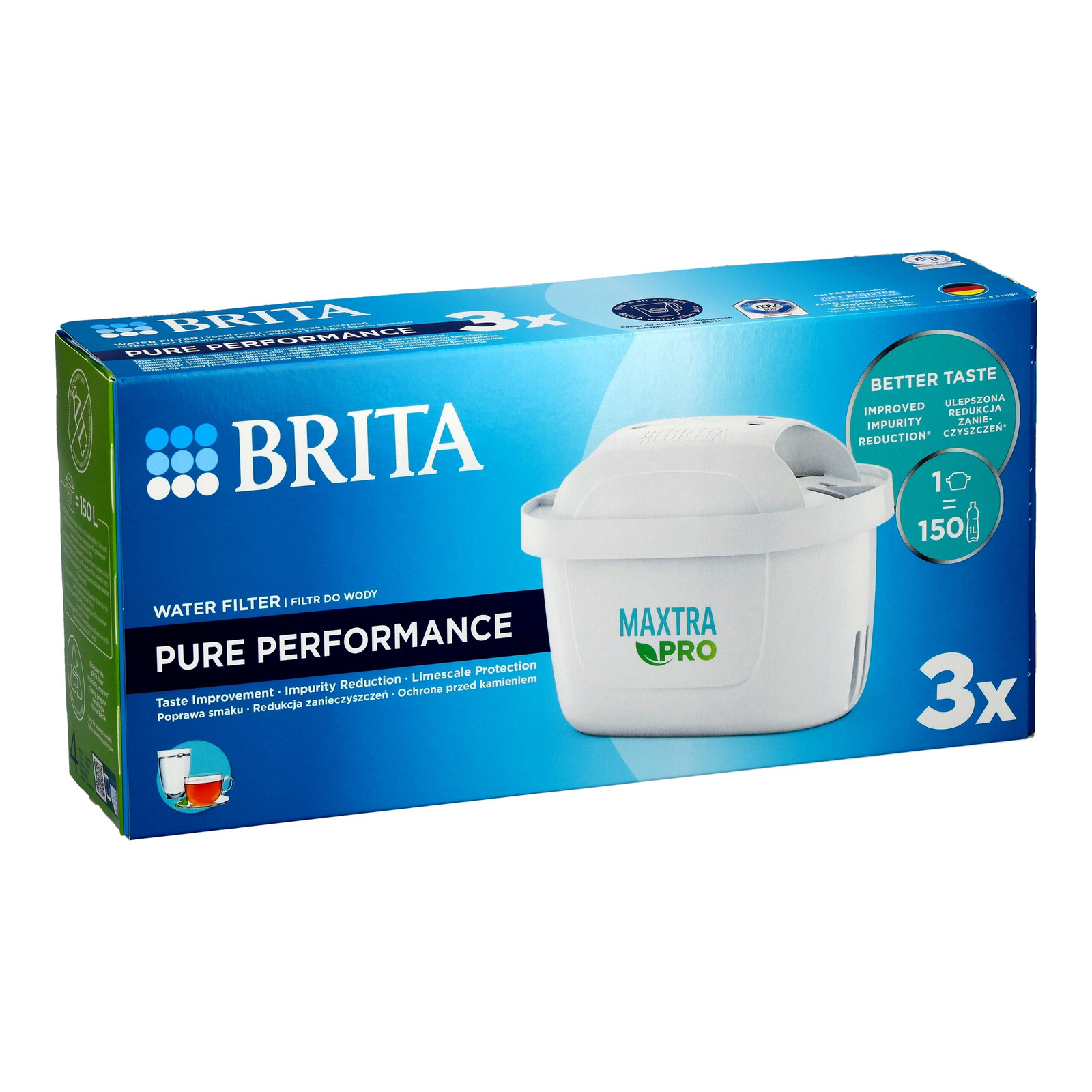 BRITA MAXTRA PRO Pure Performance Wasserfilterkartuschen (3 Stück) sind die ideale Wahl für alle, die zuhause täglich gefiltertes Trinkwasser in hoher Qualität genießen möchten. Das fortschrittliche Filtersystem reduziert zuverlässig Chlor, Schwermetalle und weitere unerwünschte Verunreinigungen, die Geschmack und Geruch beeinträchtigen können. So profitieren nicht nur Ihre Getränke – auch Tee, Kaffee und Speisen schmecken spürbar besser.