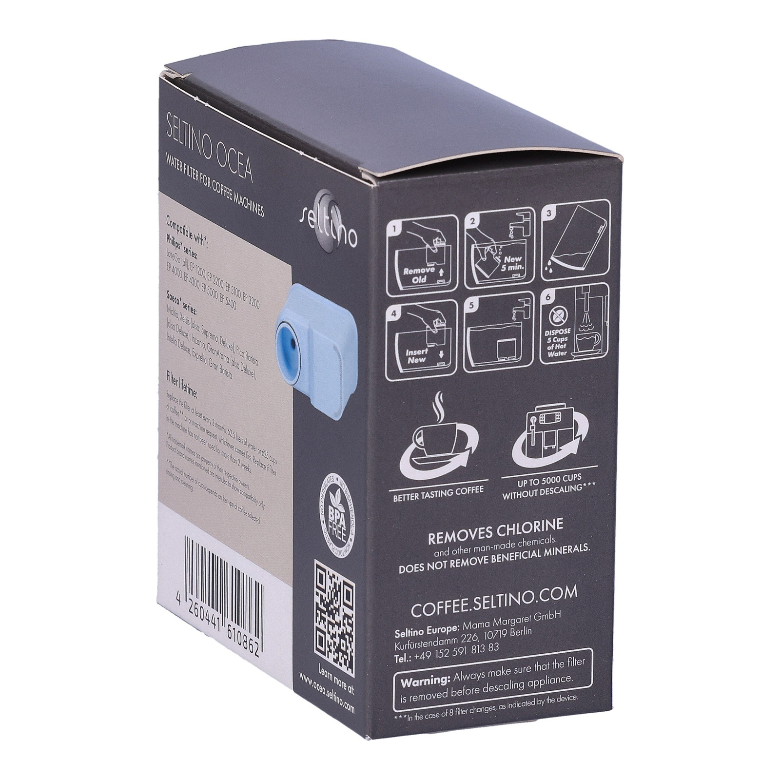 Dank der durchdachten Kombination aus Aktivkohle und Ionenaustauscherharz reduziert Seltino Ocea unerwünschte Stoffe wie Chlor und andere Verunreinigungen und bindet gleichzeitig Calcium- und Magnesium-Ionen. Das Ergebnis: weicheres Wasser, weniger Kalkbelastung und ein geschmacklich klarerer Kaffee – Tasse für Tasse.